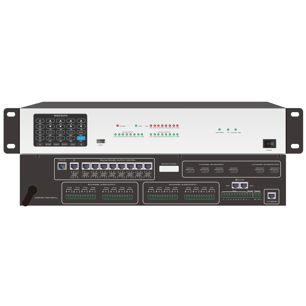 支持4.3寸觸摸屏,10路中控接口,8路音頻輸入8路音頻輸出,4路視頻輸入2路視頻輸出,內置4路DANTE輸入,4路DANTE輸出